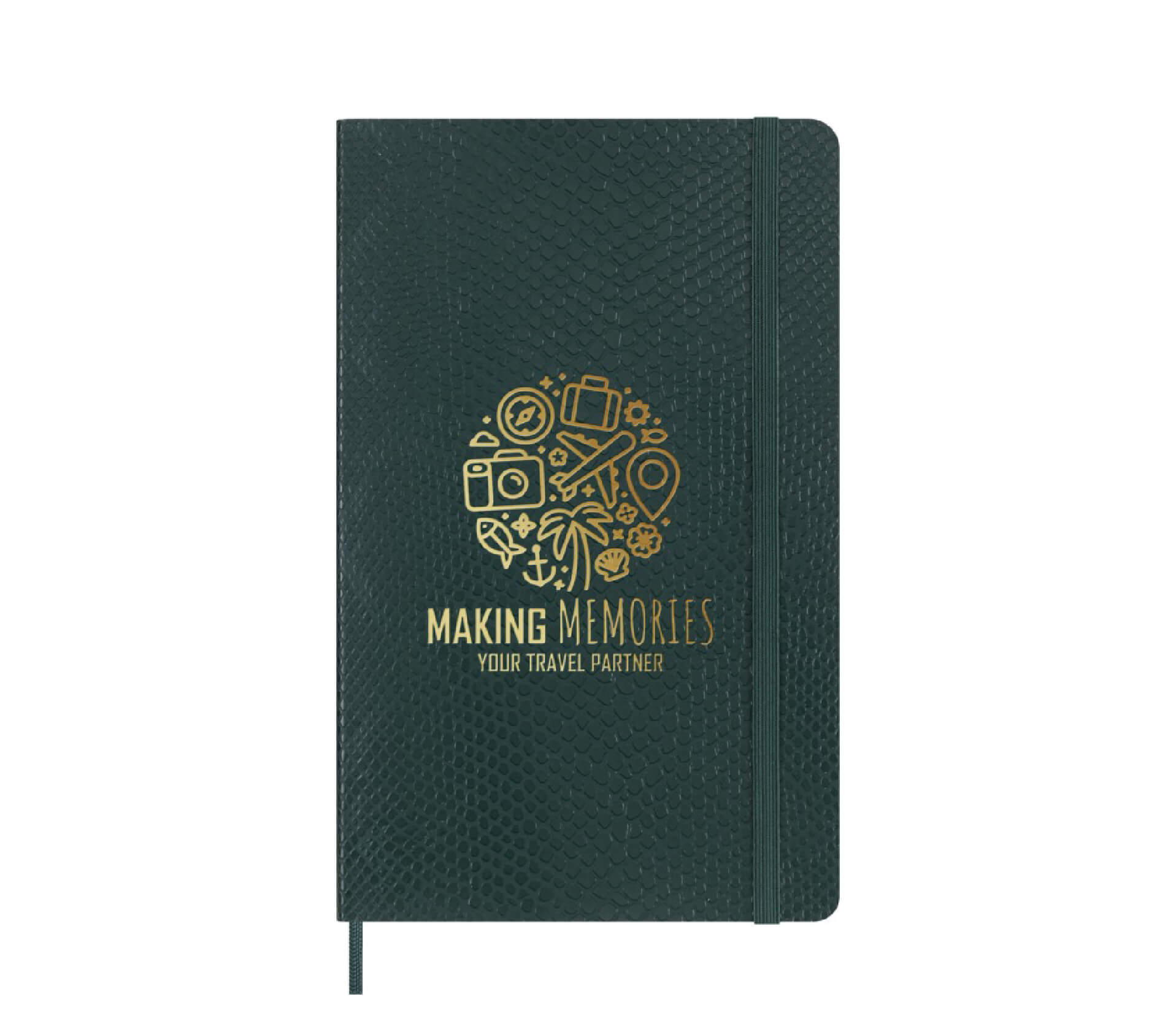 Copertina morbida effetto pitone (100% VEGEA®) e una chiusura elastica. Carta avorio da 100 g/m², con tasca espandibile, adesivi per personalizzare il dorso e un avviso per chi lo trova. Il tutto certificato FSC.