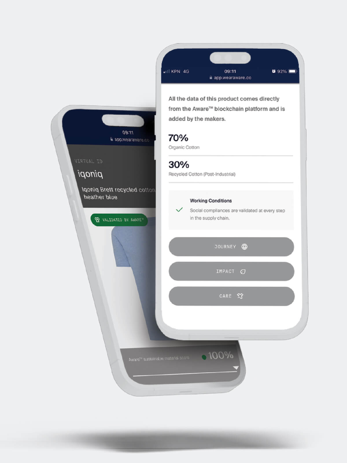 Impact Aware™ è una tecnologia avanzata che utilizza tracciabilità “fiber-forward” e blockchain per certificare l’intera filiera del prodotto, dalla materia prima al prodotto finito.