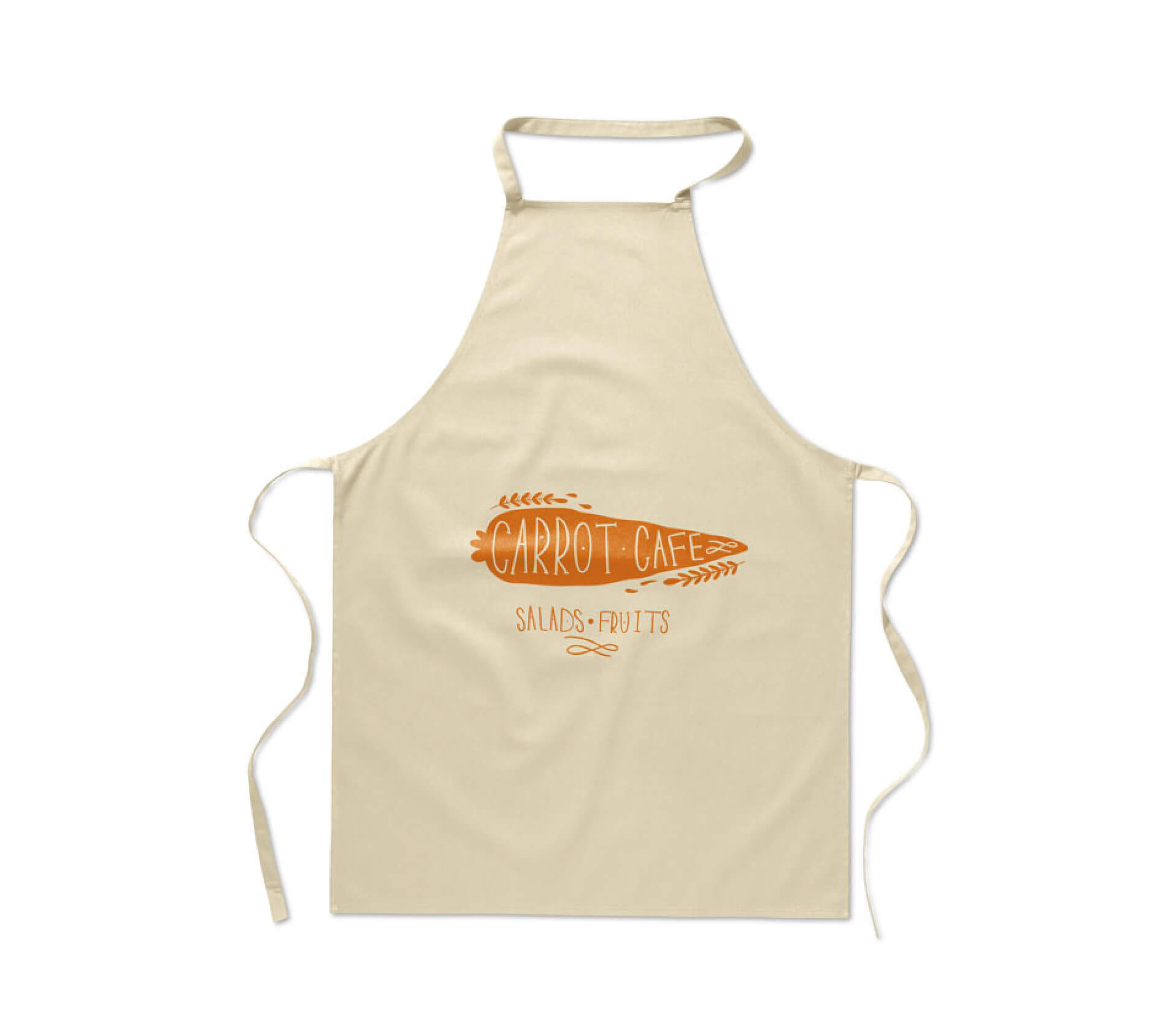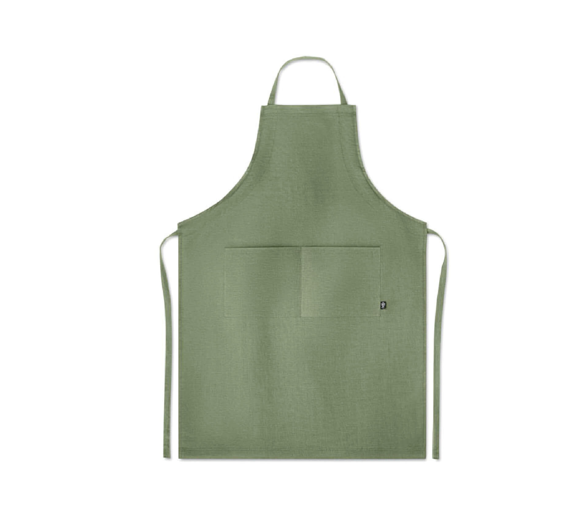 Grembiule lungo in cotone riciclato da 190 g/m², dotato di lacci regolabili al collo e allacciatura posteriore da 110 cm. Robusto e sostenibile, è ideale per cucina o attività promozionali..