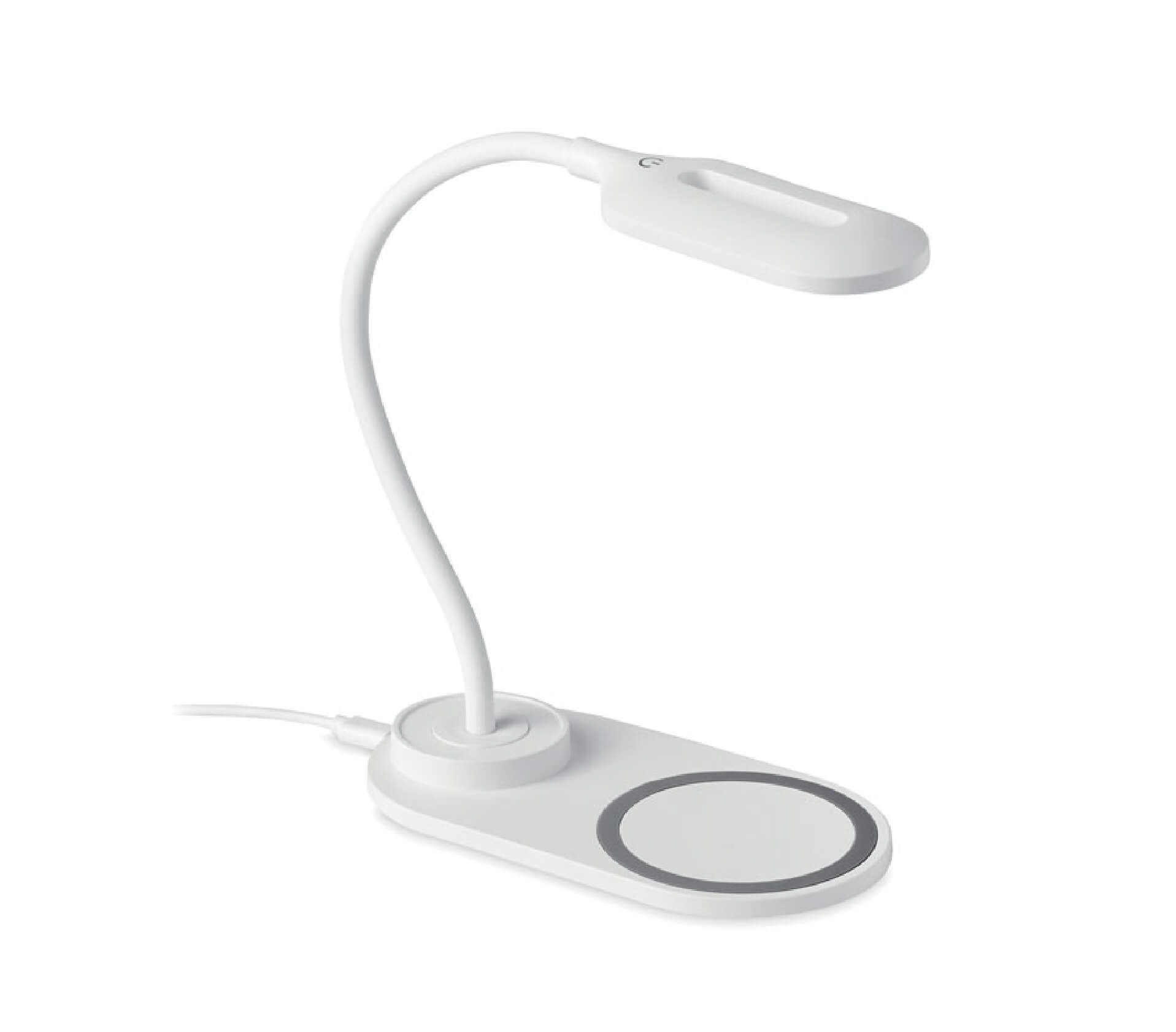 Lampada da tavolo in ABS dal design moderno, dotata di 10 LED e caricatore wireless da 10W integrato.Compatibile con dispositivi Android di ultima generazione e con iPhone® 8 o modelli successivi.