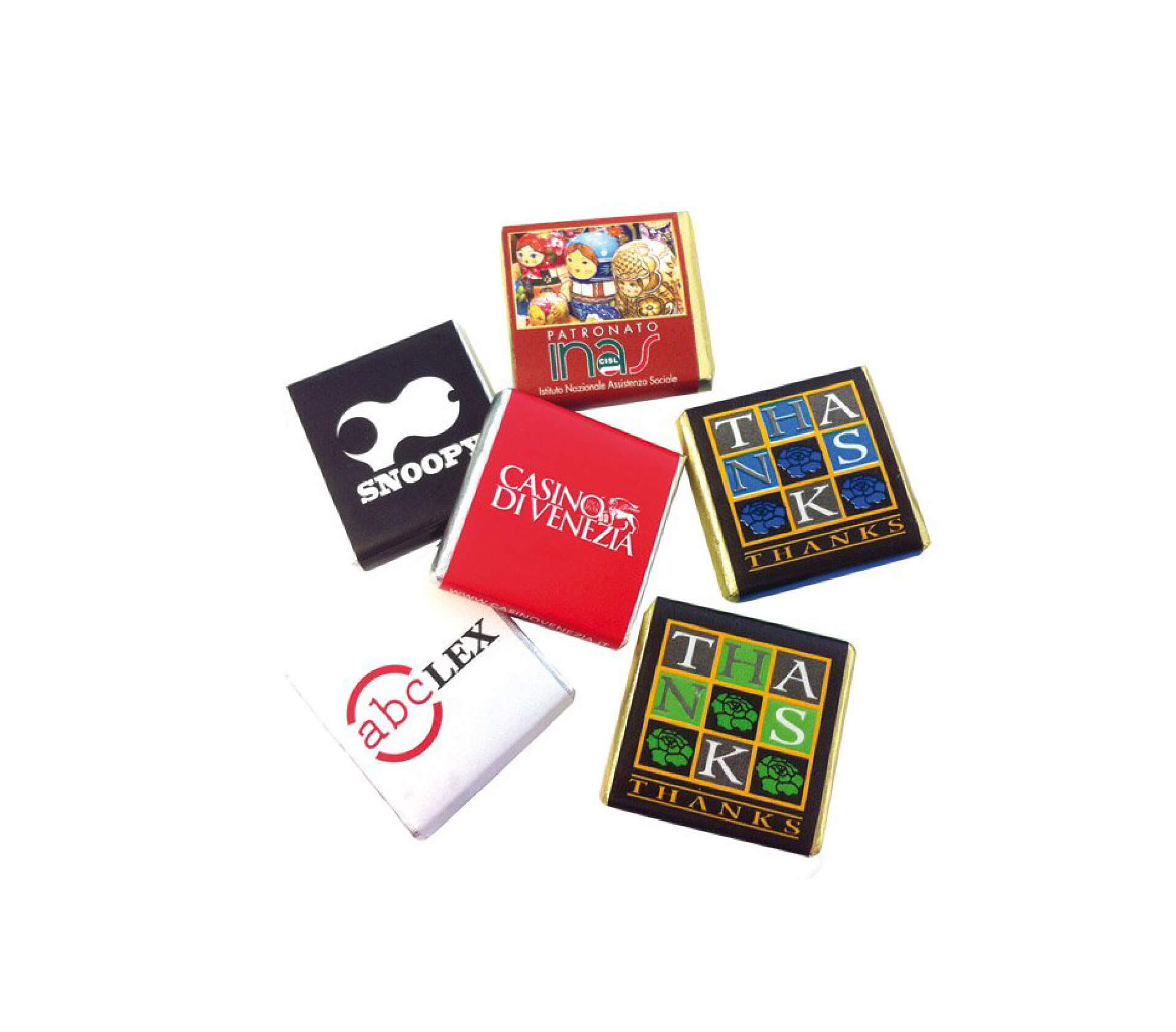 Cioccolatini al latte o fondente confezionati singolarmente con foglio di alluminio argento o oro ricoperto da una fascetta di carta bianca personalizzabile..