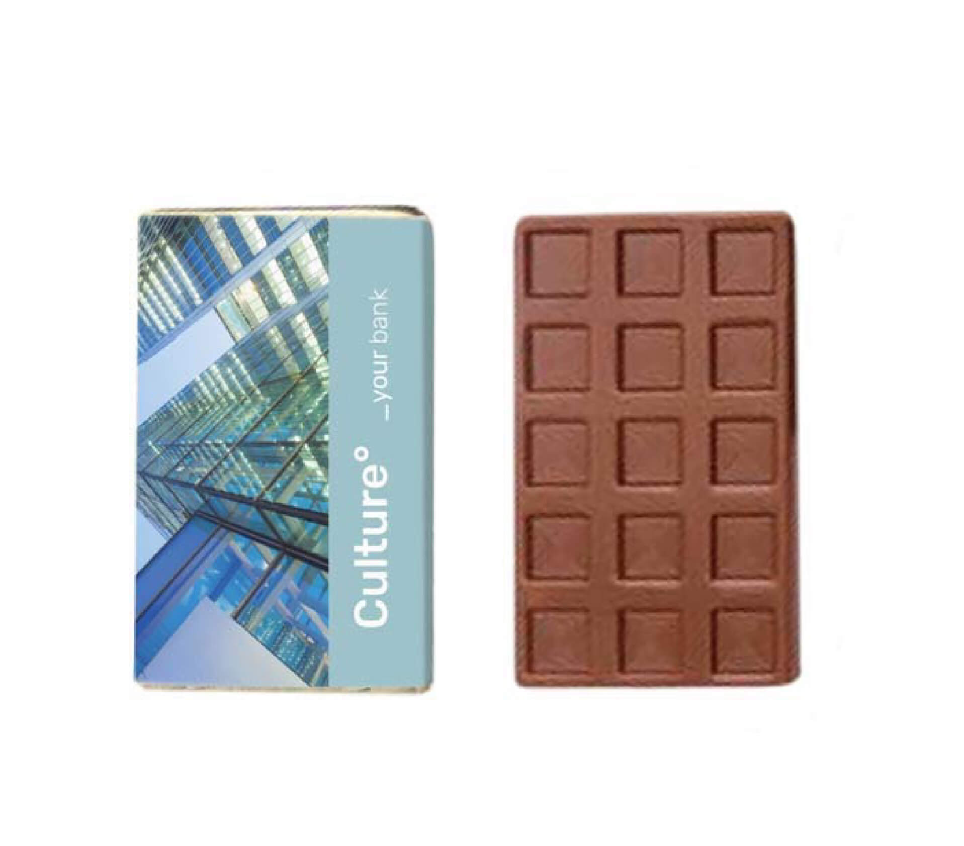 Tavoletta di cioccolato al latte o fondente con flowpack oro e astuccio in cartoncino bianco personalizzato in quadricromia.