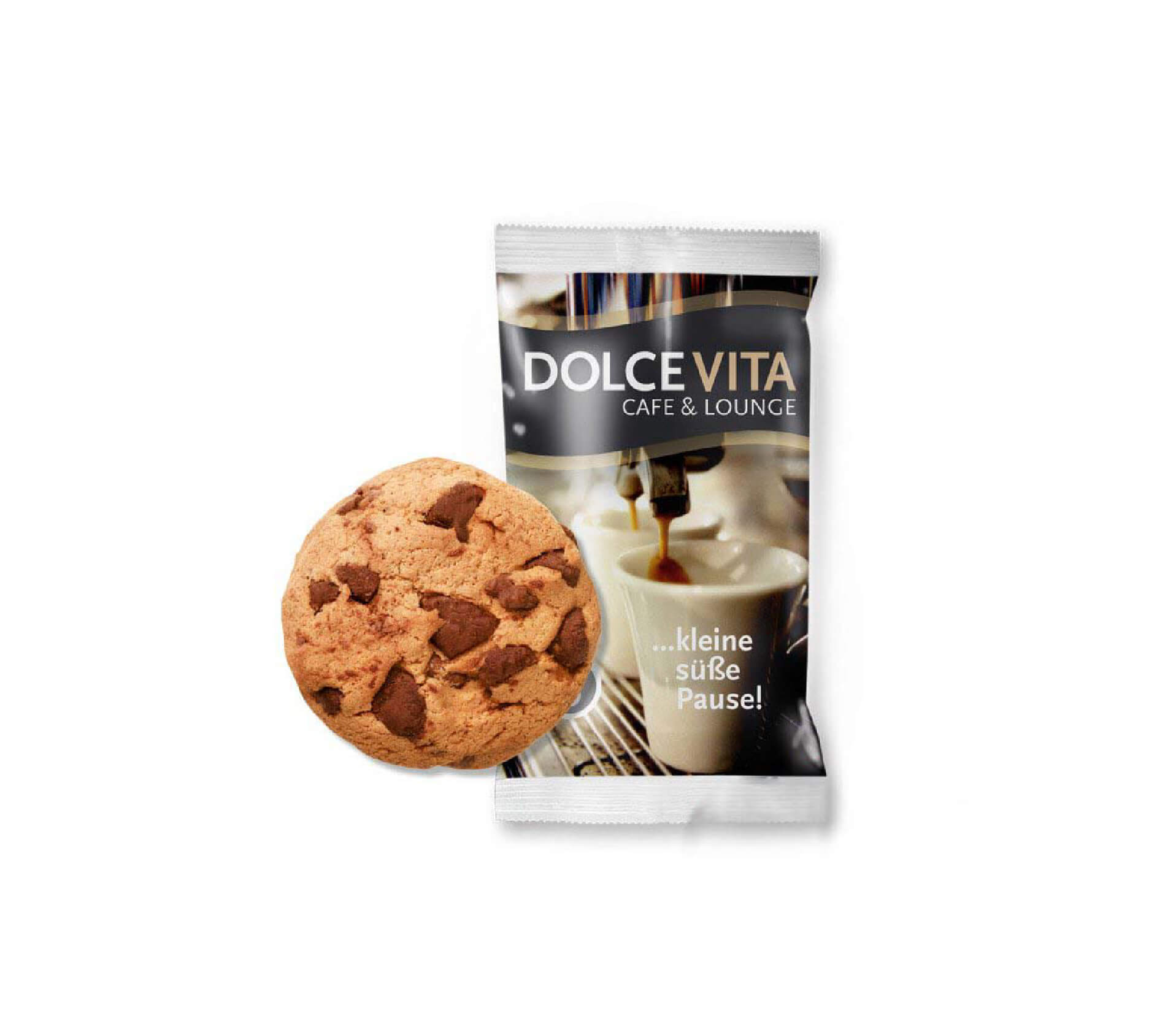 Biscotto con gocce di cioccolato al latte e fondente (40%) confezionati singolarmente con incarto flowpack bianco personalizzabile.