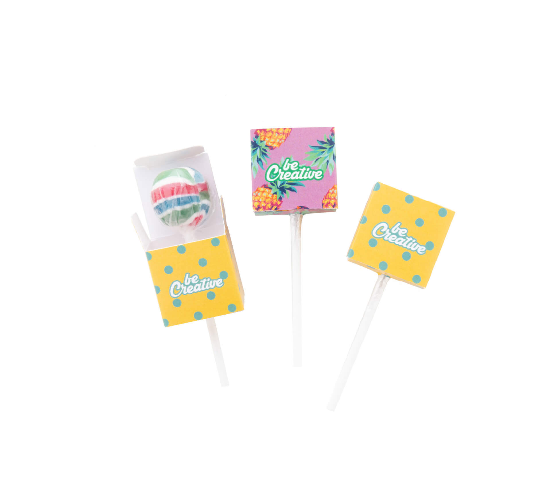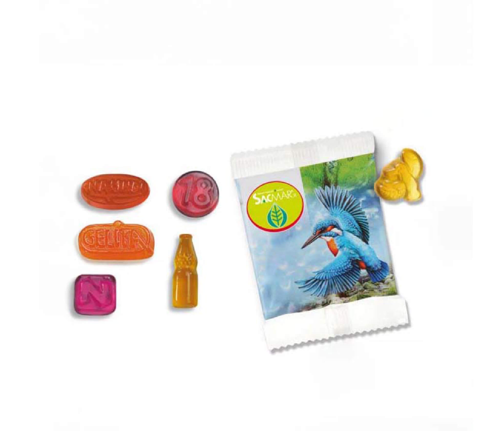Bustina trasparente o bianca con gommosi a forma personalizzata al gusto frutta (Limone, Frutto della passione, Arancio, Lampone, Ananas, Ciliegia) con il 10% succo di frutta. Stampa il tuo logo sull’incarto!