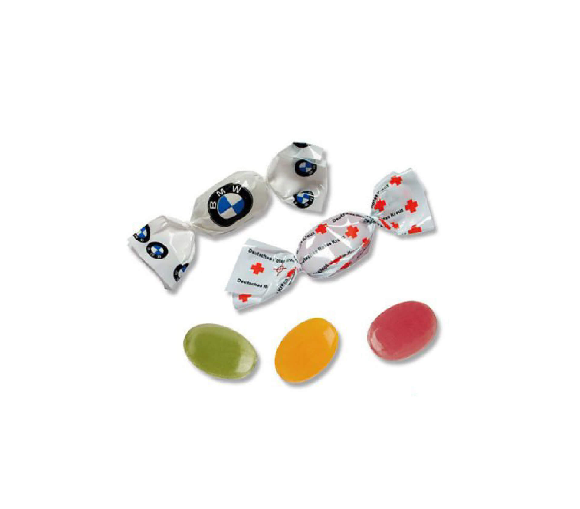 Caramelle pubblicitarie ovali dure ai gusti frutta assortita o menta. Confezionate singolarmente con incarto doppio fiocco bianco, trasparente o metallizzato.