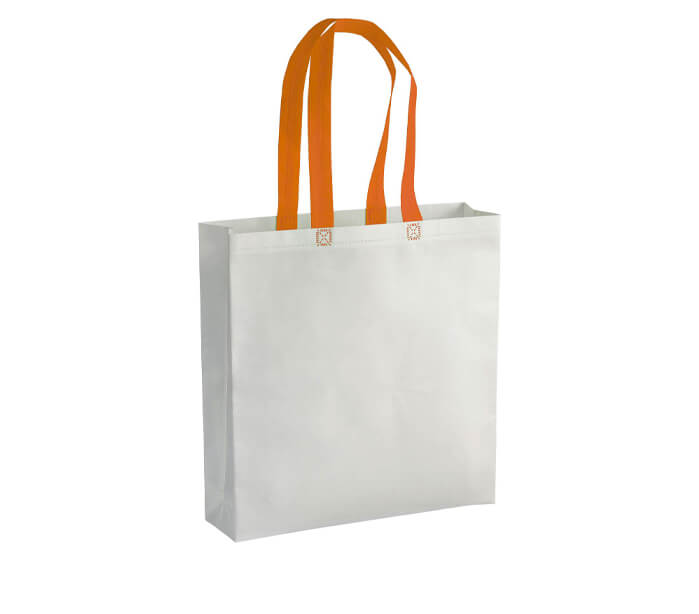 Shopper con soffietto in TNT laminato 100 gr/m² termosaldato, manici lunghi colorati a contrasto, abbina il colore al tuo logo per un effetto stiloso.
