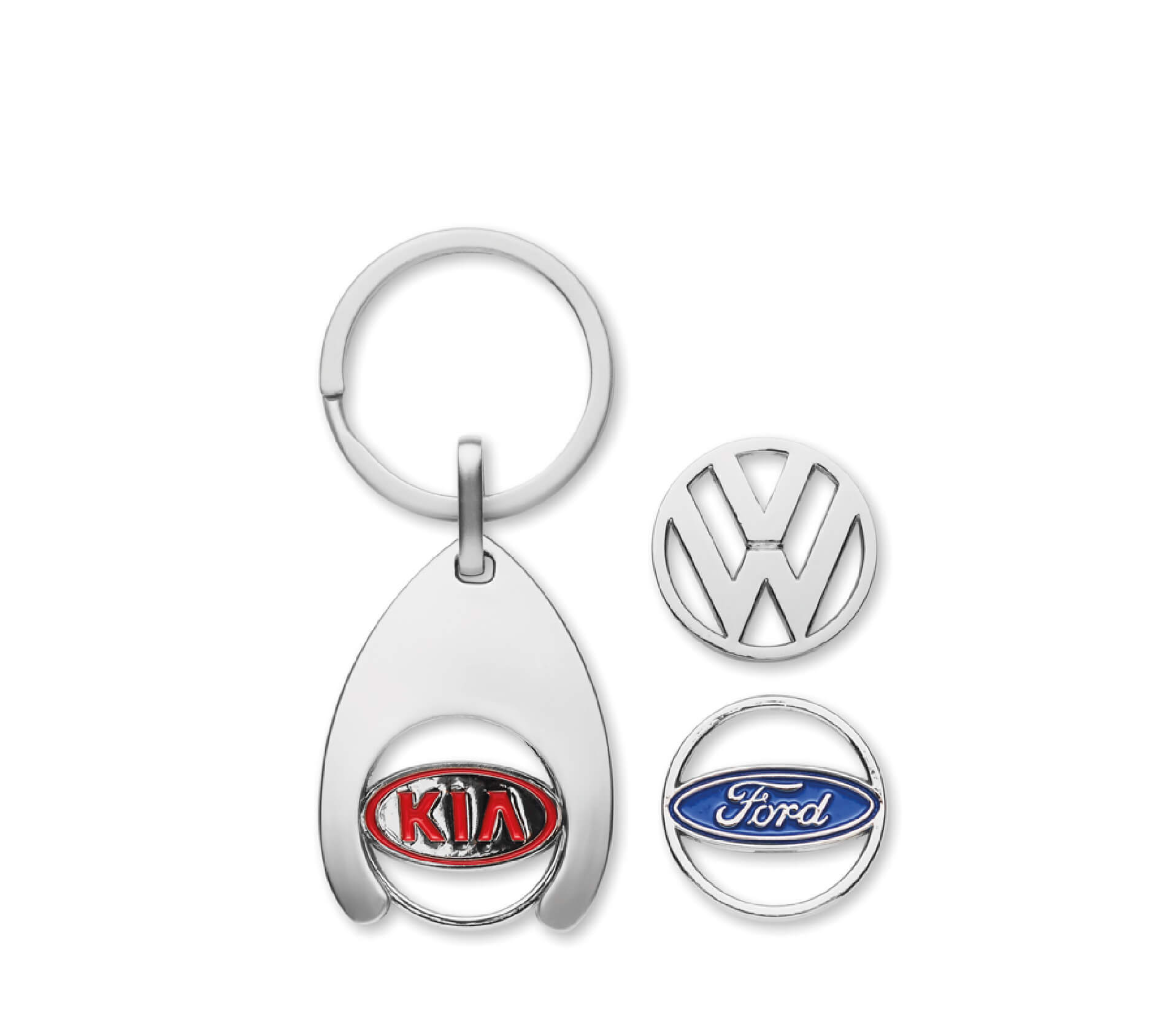 Portachiavi gettone per carrello , possibilità di scegliere fra 3 varianti del gettone smaltato con superficie incassata. Anello piatto. Il gettone simula moneta da 1 euro.