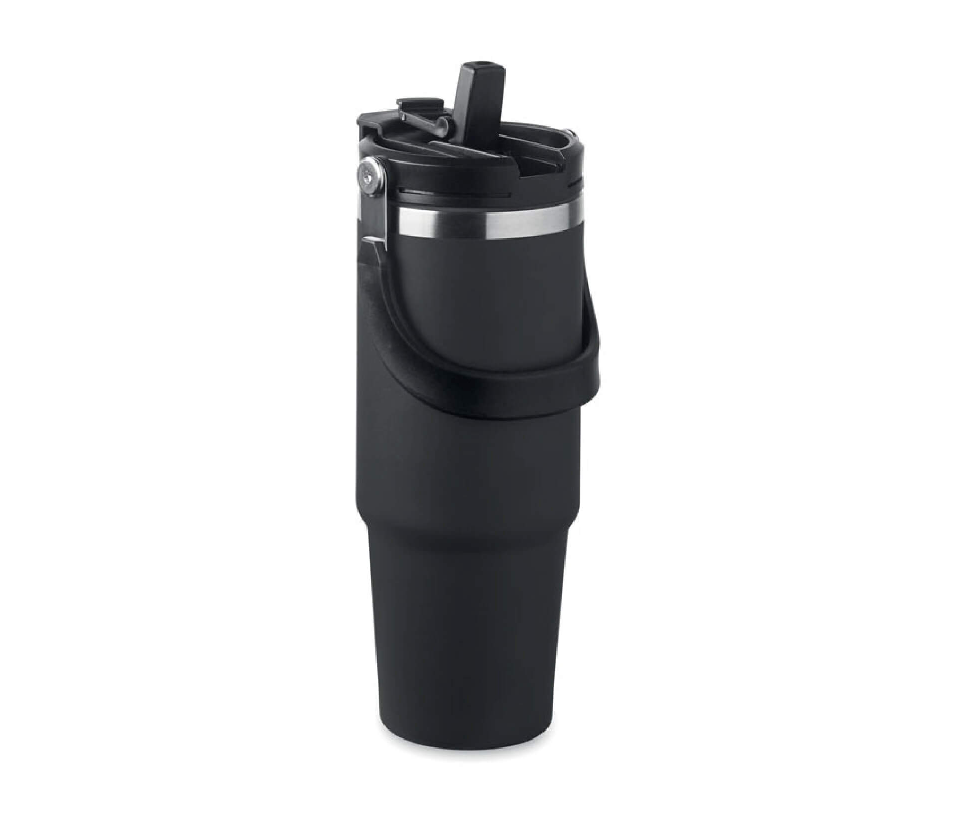 Bicchiere a doppio strato in acciaio inox riciclato con coperchio con cannuccia interna, imboccatura pieghevole e apertura per bere direttamente. Capacità 850 ml.