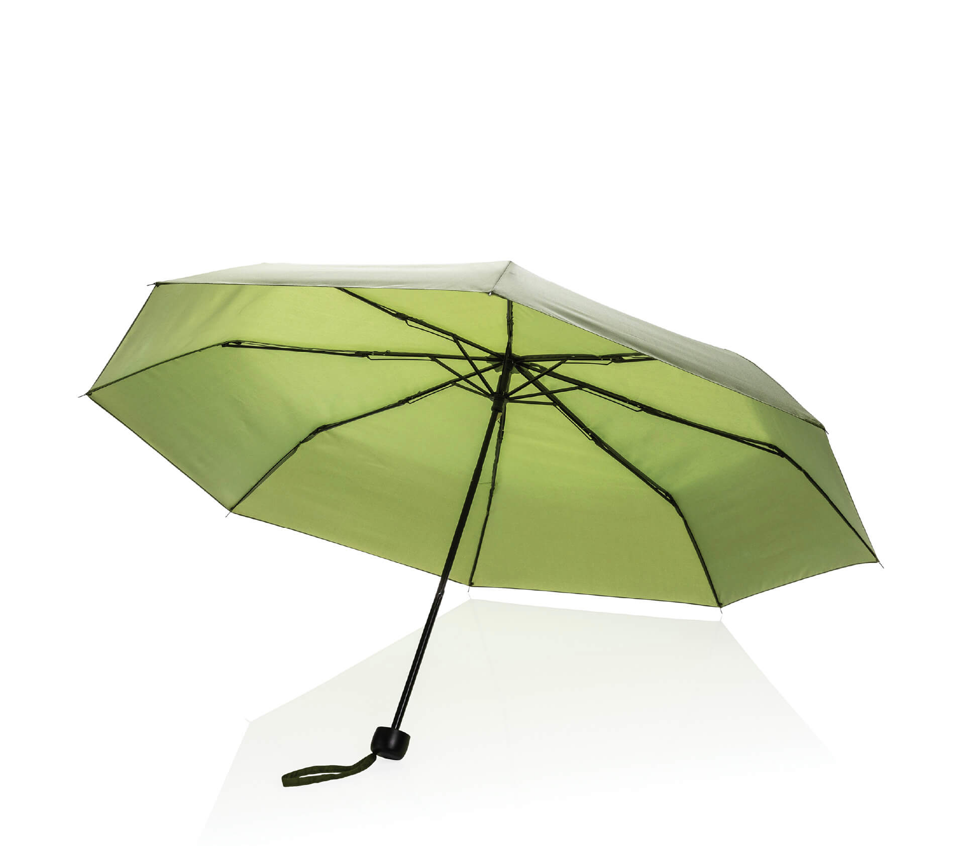 Mini ombrello pieghevole in rPET con traccianti AWARE™, manico in bambù. Realizzato con 7,1 bottiglie riciclate, dona il 2% a Water.org. Compatto, sostenibile, trasparente.