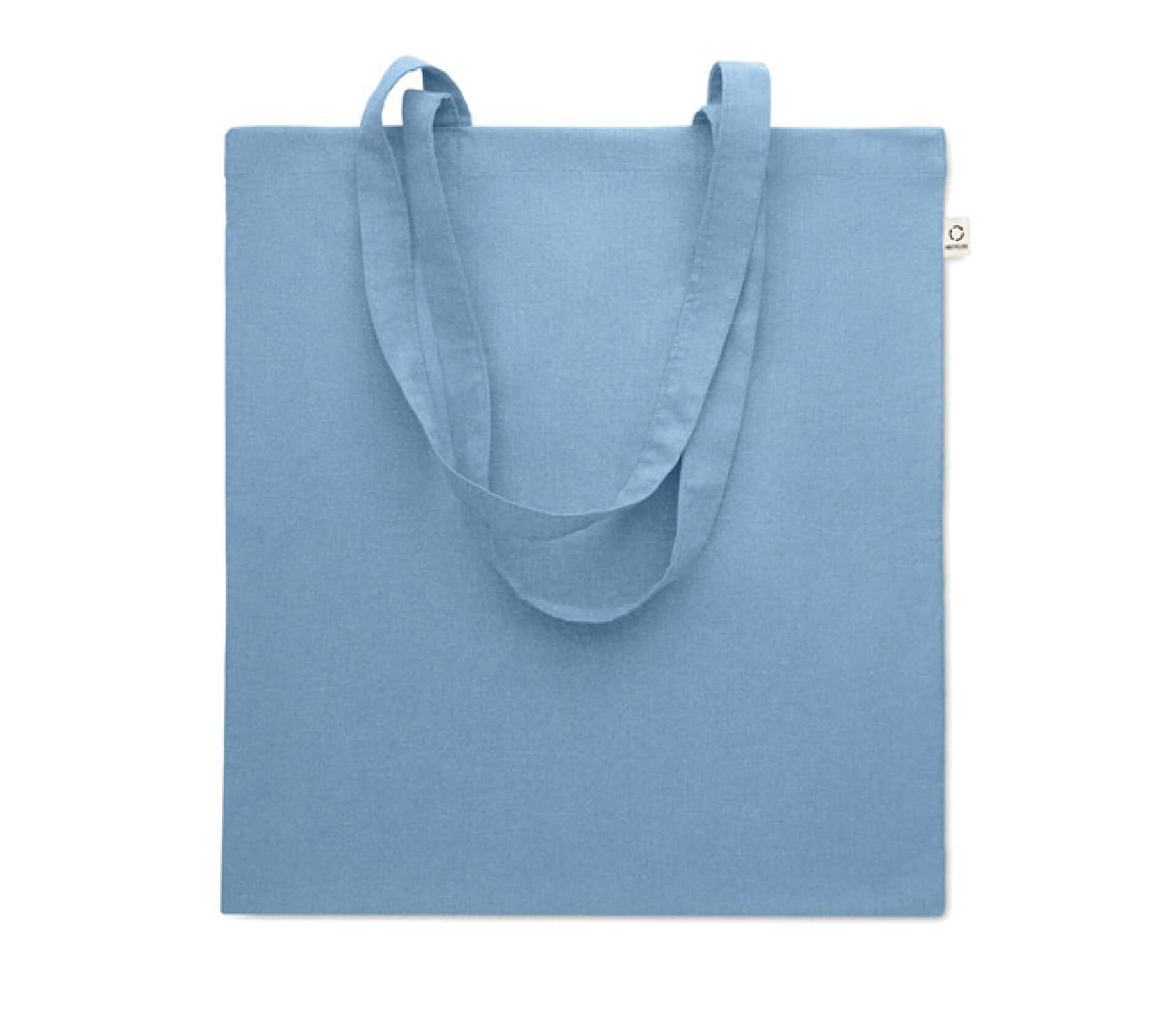 Shopper in cotone riciclato post-consumo (70% cotone riciclato e 30% RPET) con manici lunghi, 140 gr/m². Una borsa sostenibile per campagne promozionali di successo.