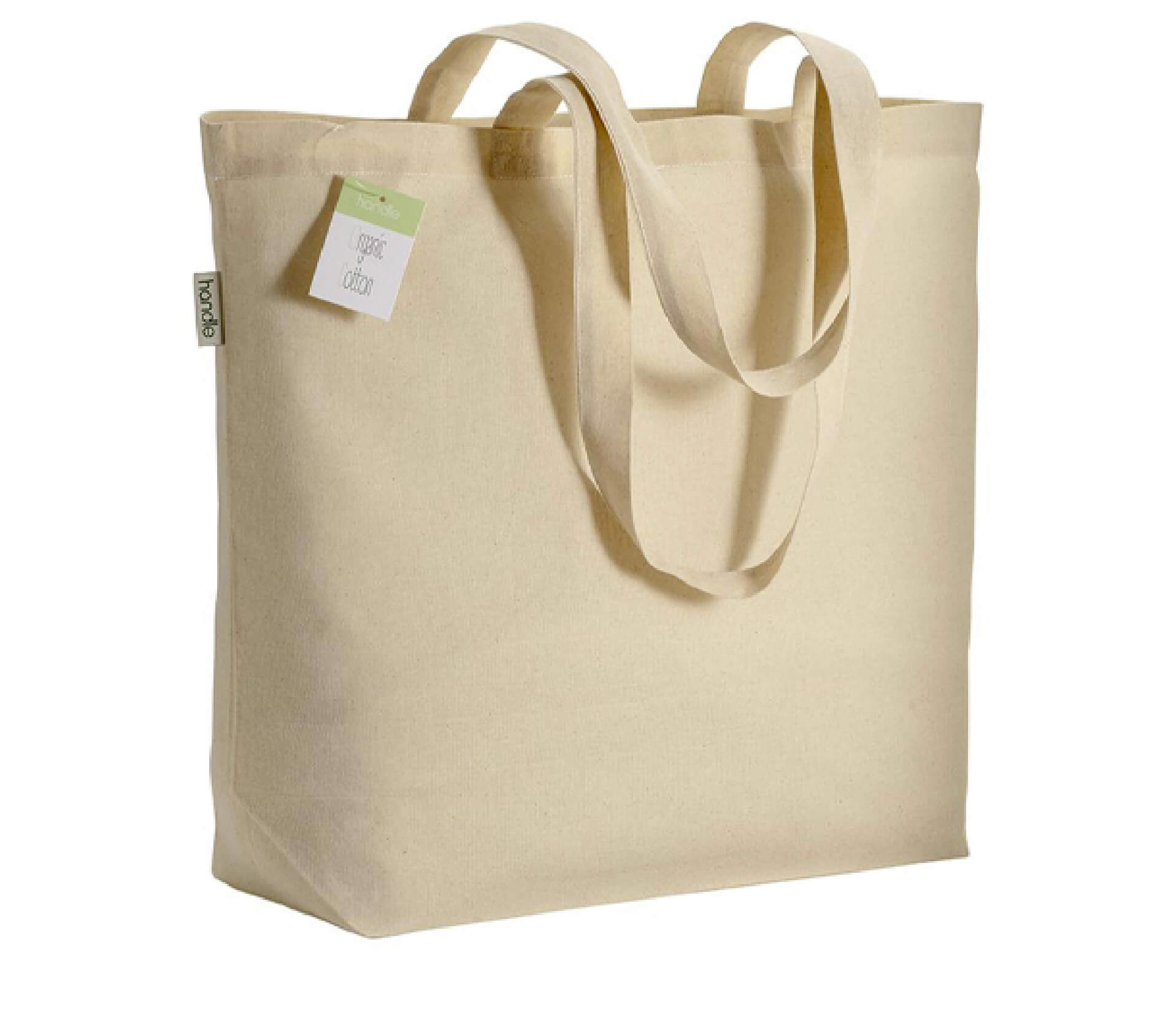 Borsa dalle misure generose in cotone biologico da 220 g/m² con manici lunghi e soffietto alla base.