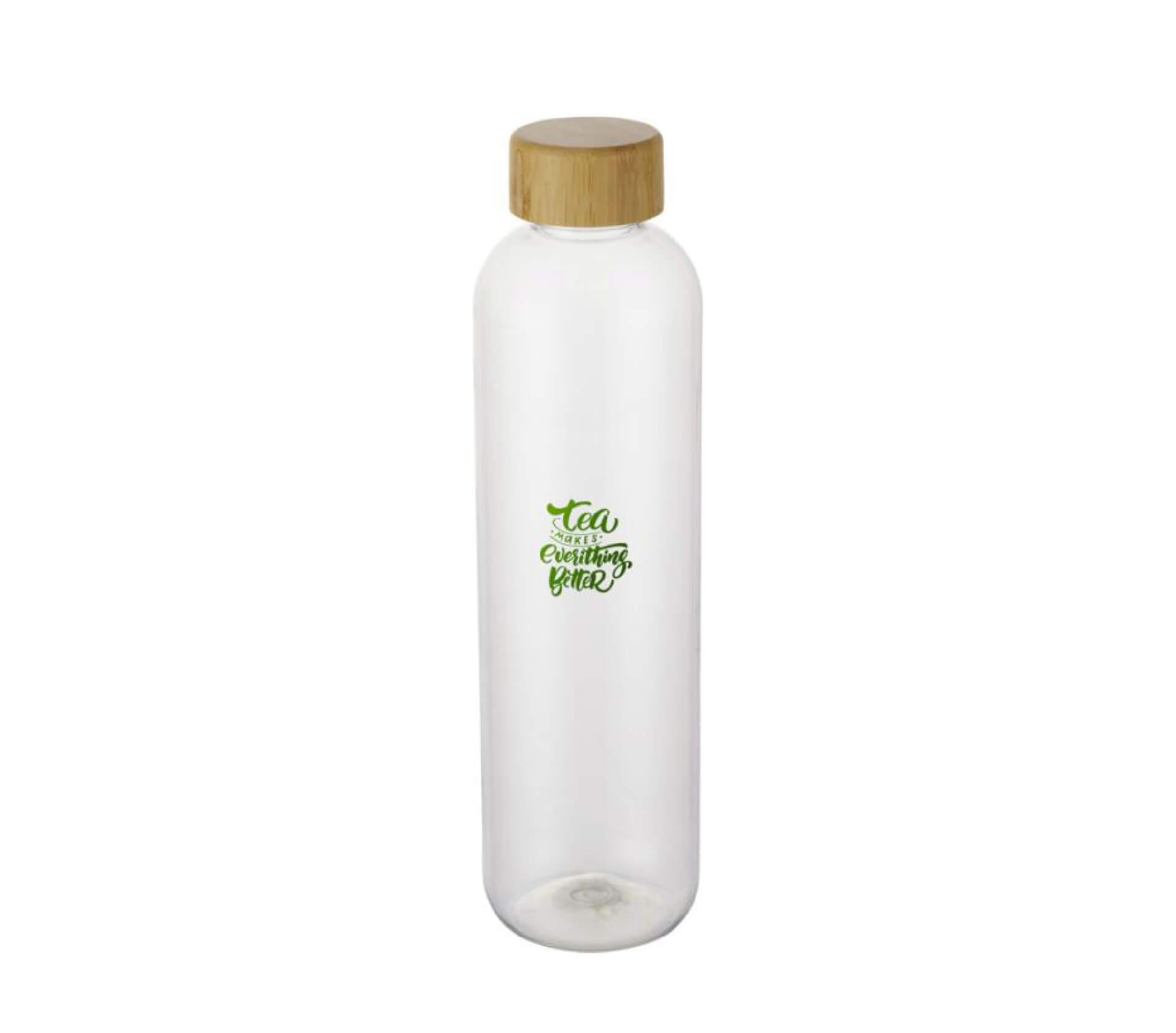 Borraccia riutilizzabile in plastica riciclata, con un elegante coperchio in bambù. La borraccia a parete singola. Capacità di 950ml. È consigliato lavarla a mano.