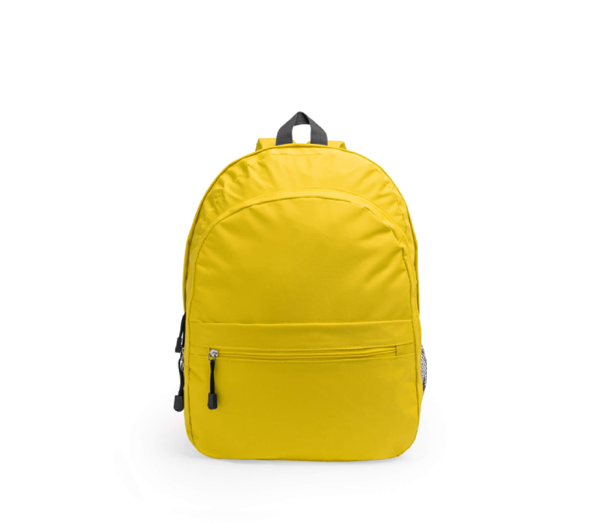 Zaino in poliestere 600D con due scomparti principali e tasca frontale. Tasca laterale in rete. Spallacci e schienale imbottiti..