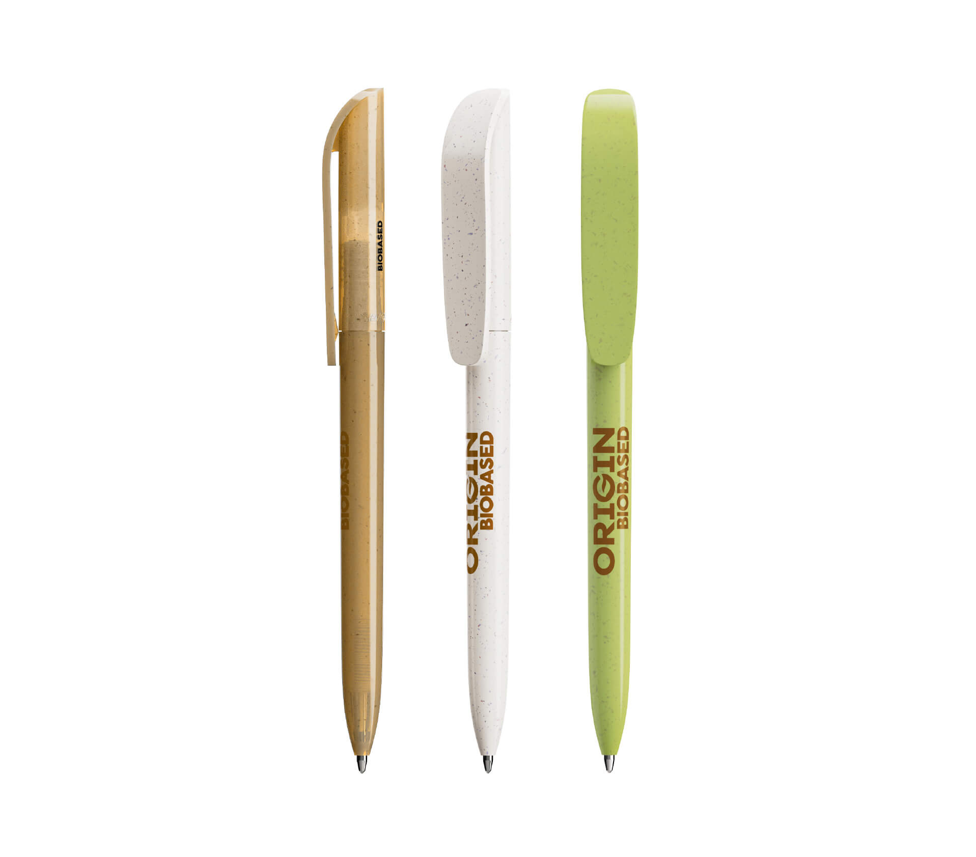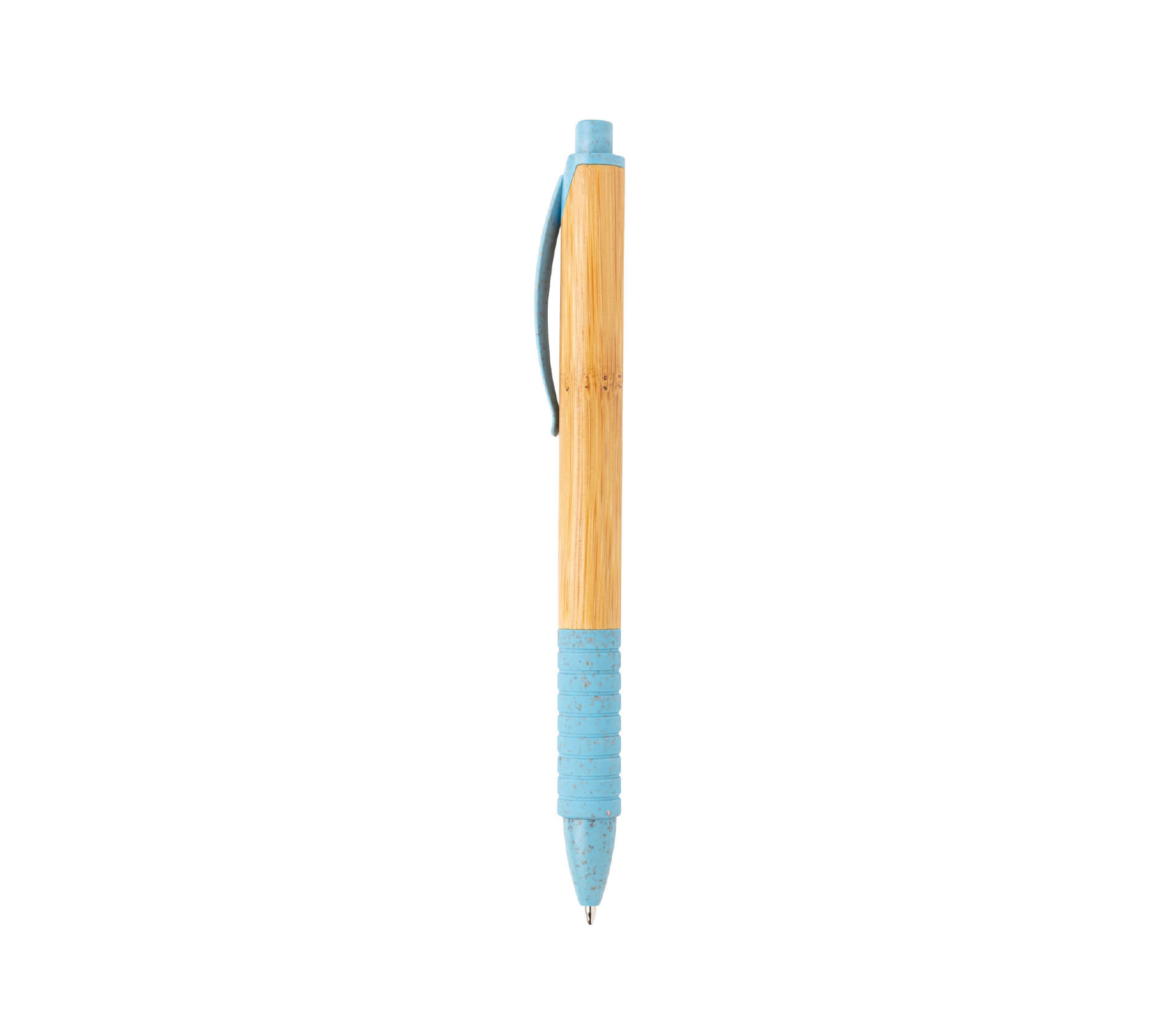 Penna a sfera a pulsante con fusto in bambù e finiture in paglia di grano (50%) e plastica ABS (50%). Inchiostro blu. Un'ottima alternativa sostenibile per il tuo merchandising.