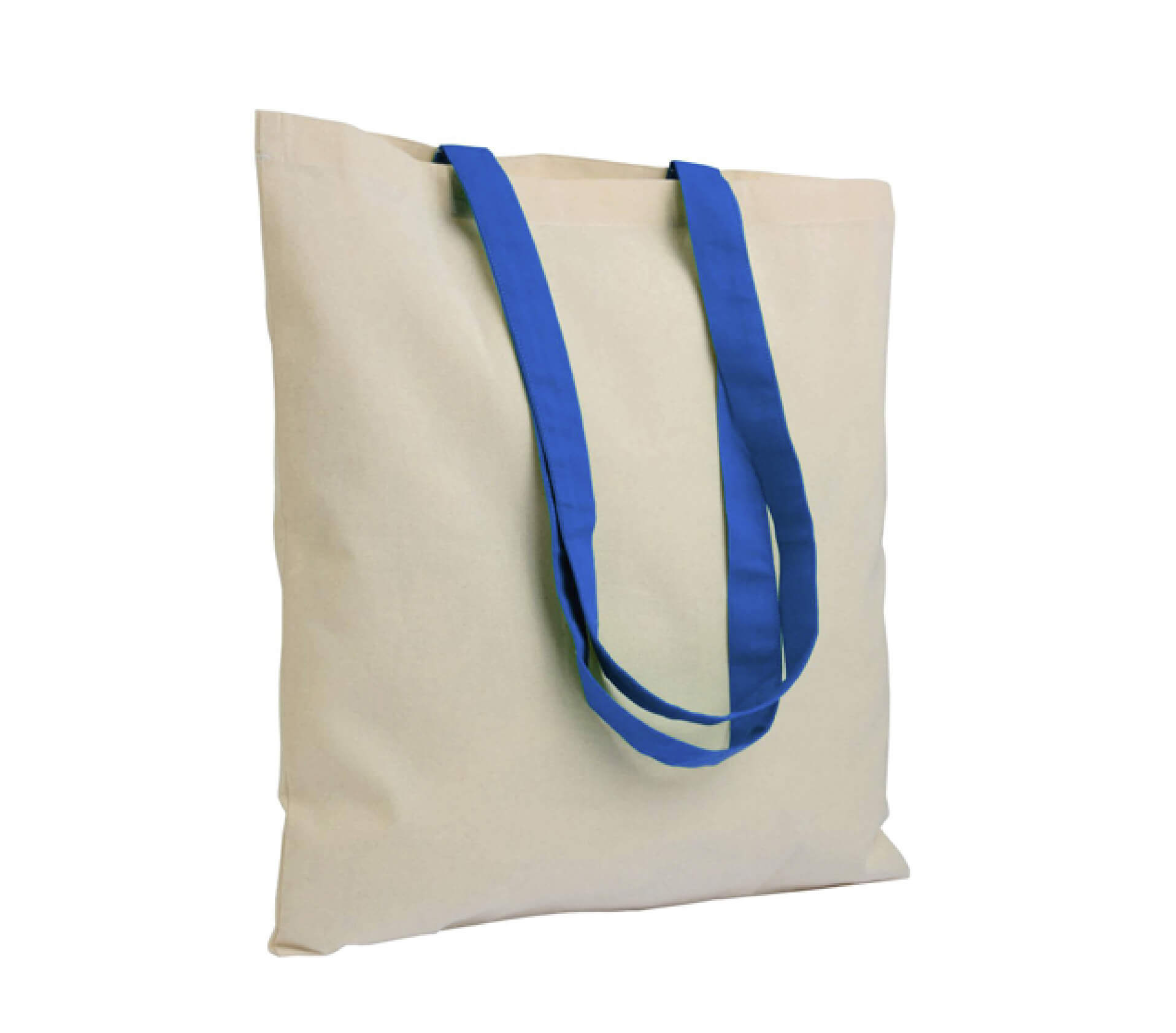 Borsa in cotone riciclato da 140 g/m² colore naturale con manici colorati a contrasto. Dotata di manici lunghi per un comodo trasporto a mano e a spalla. È certificata GRS (Global Recycled Standard).