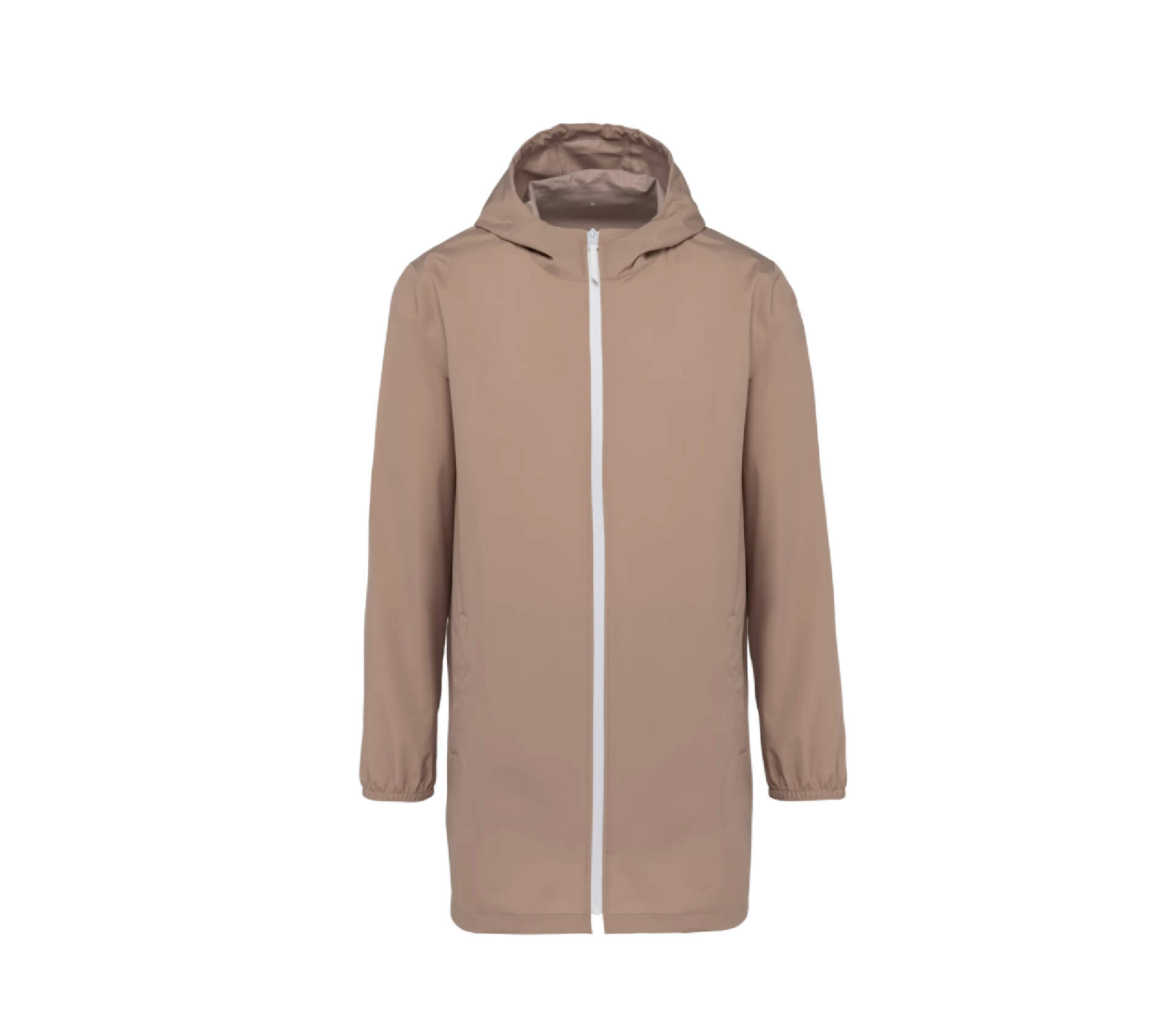 impermeabile, leggero e pratico. Full zip tono su tono, cappuccio a scomparsa, 2 tasche con zip, fori d’aerazione e coulisse regolabile. Si ripiega nella sua tasca con elastici da allacciare in vita.