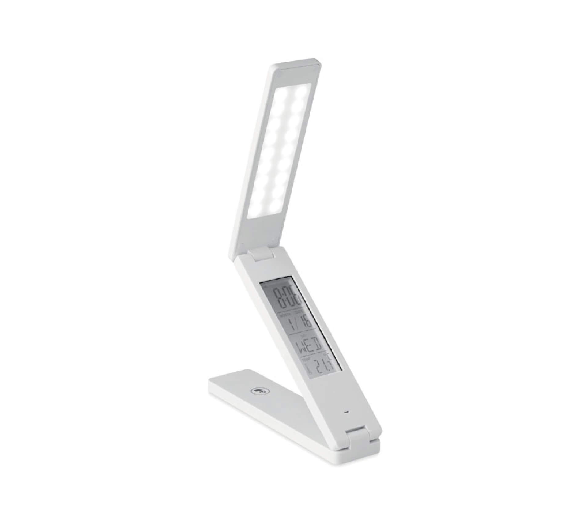 Lampada da scrivania pieghevole in ABS, dotata di 18 LED per un’illuminazione efficiente. Integra display con ora e temperatura, oltre alla funzione sveglia. Alimentata da una batteria CR2032 inclusa.