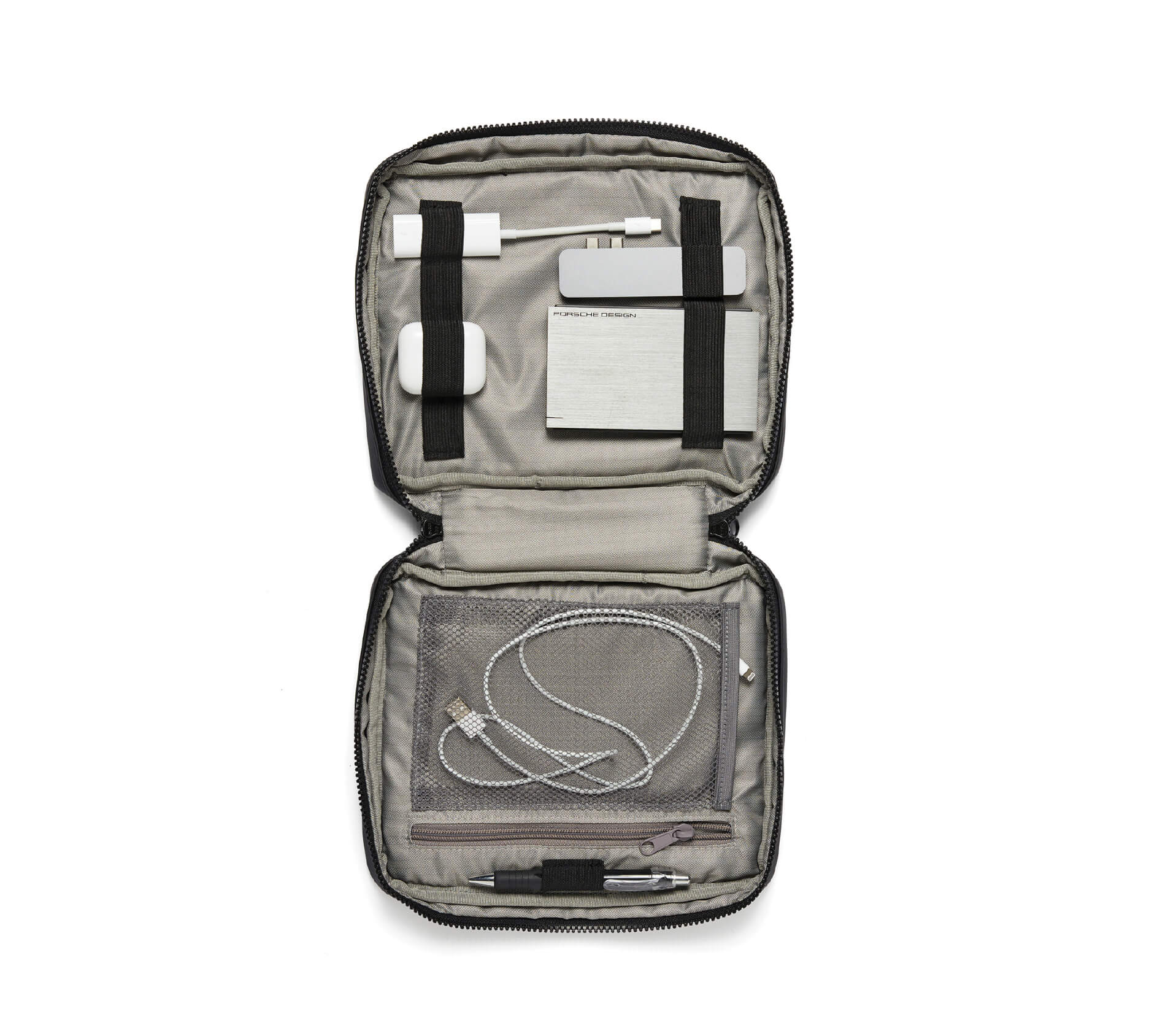 Piccolo zaino con maniglie regolabili. Maniglia superiore per appendere. Tasca frontale con zip. Tasche laterali in tessuto microforato..