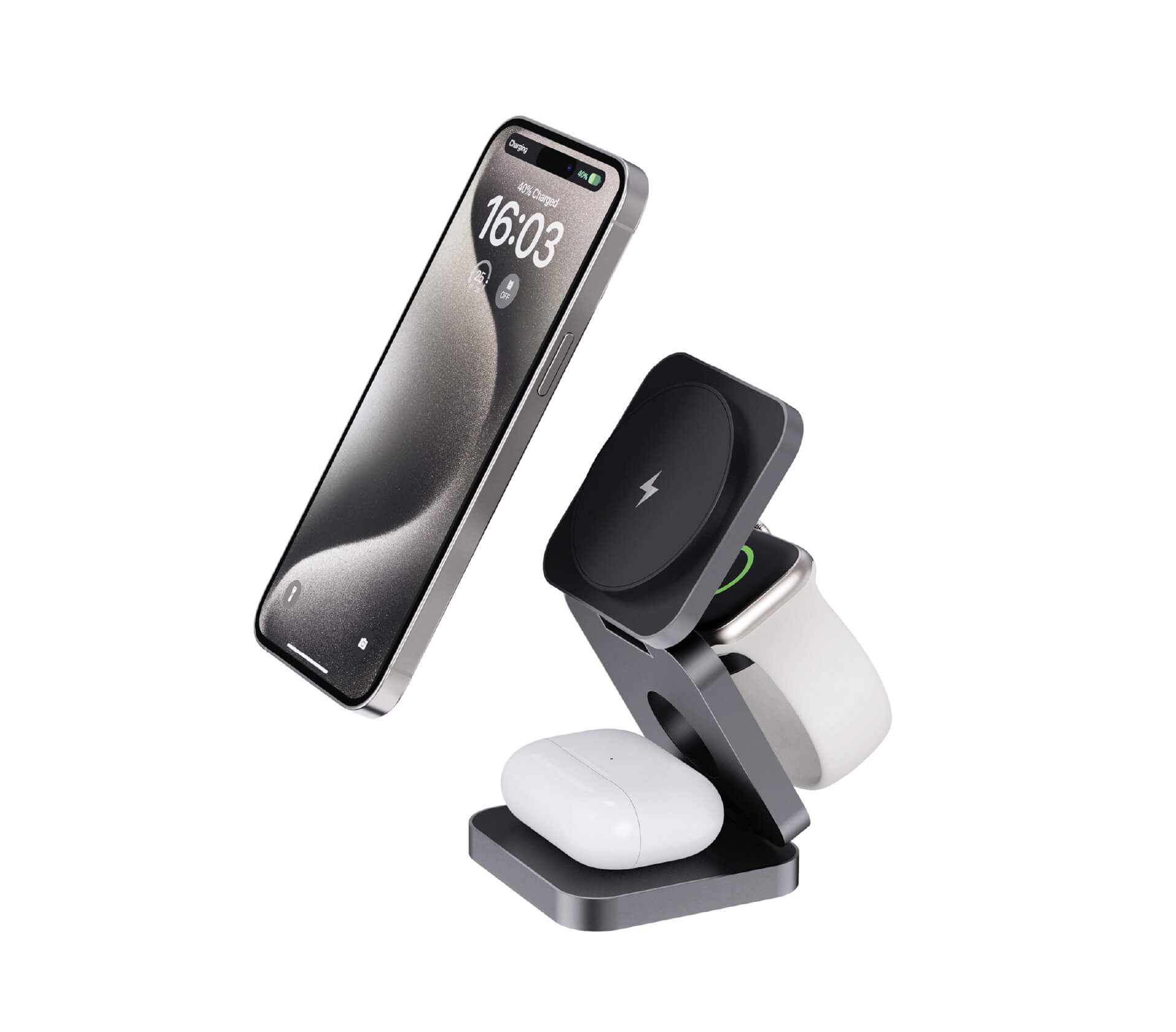 Caricatore da 15W+ caricatore da 5W e un caricatore wireless da 2,5W per gli smartwatch Apple. 3-in-1 pieghevole realizzato in ABS e alluminio riciclato RCS.