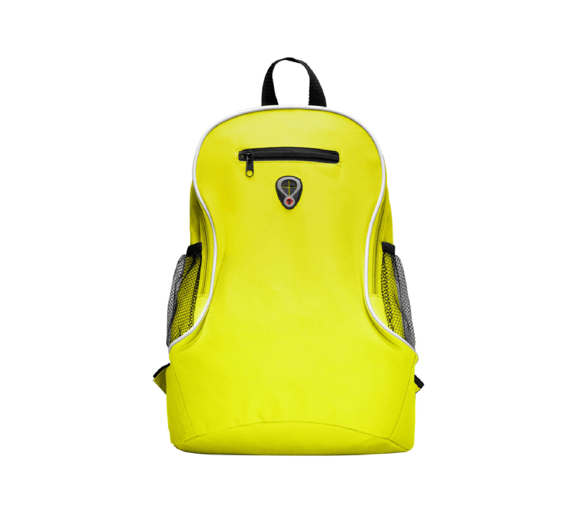 Zaino sportivo in poliestere 600D. Chiusura a zip nella tasca principale e in quella anteriore. Cordino elastico anteriore e tasche laterali in rete. Schienale e spallacci imbottiti..